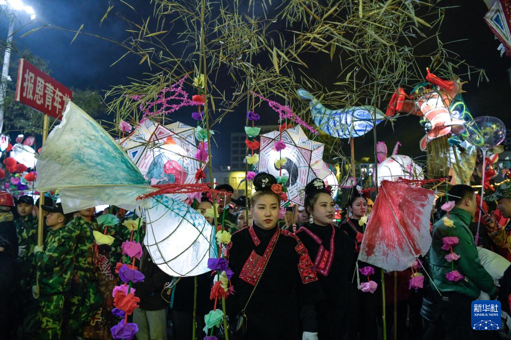 2月4日晚,在台江县,人们在参加苗族“舞龙嘘花”活动时拿着花灯等待入场。