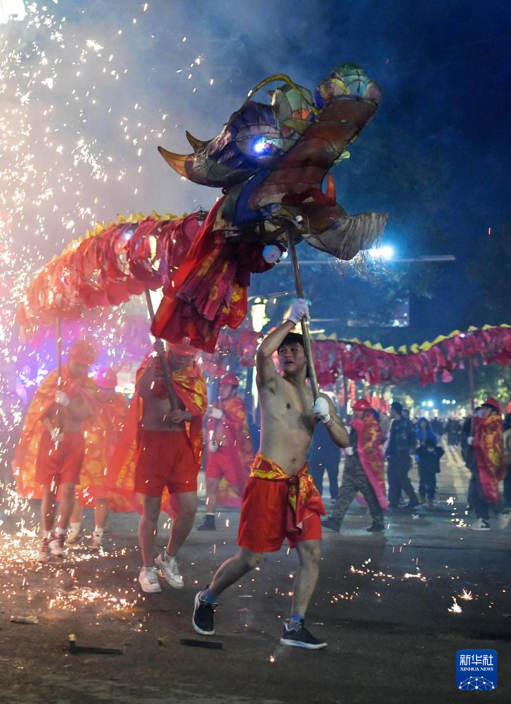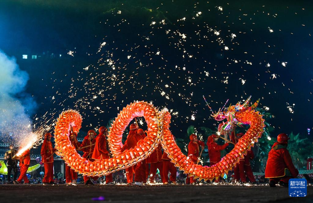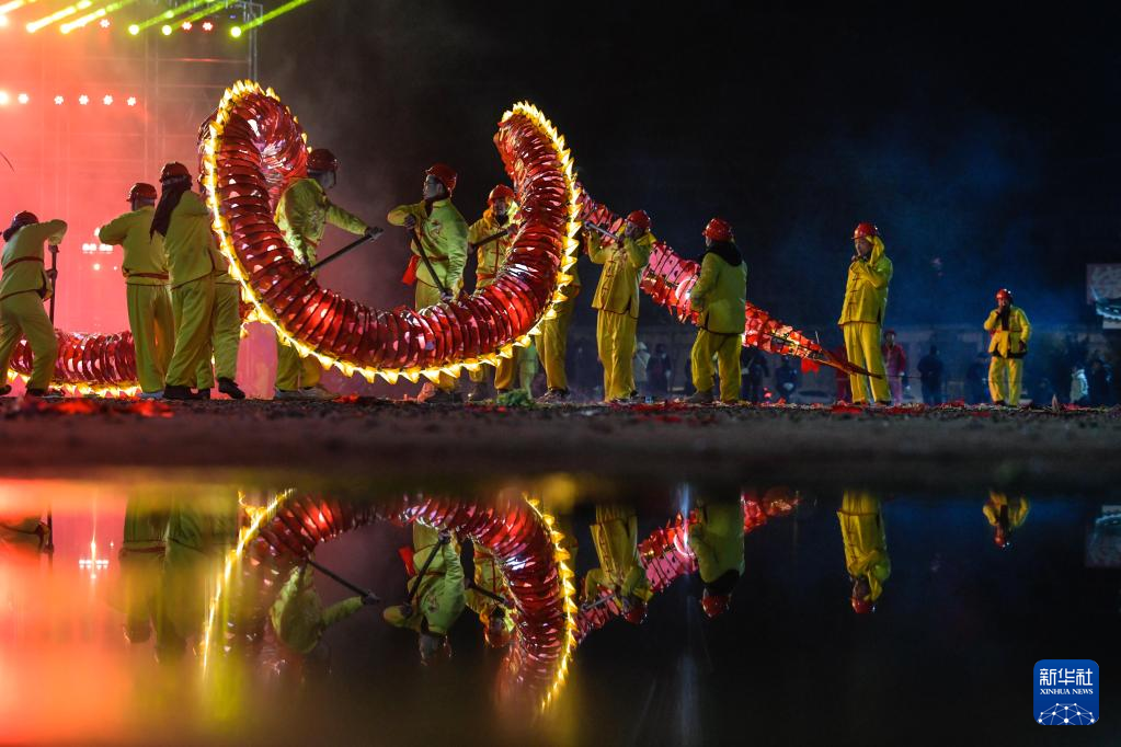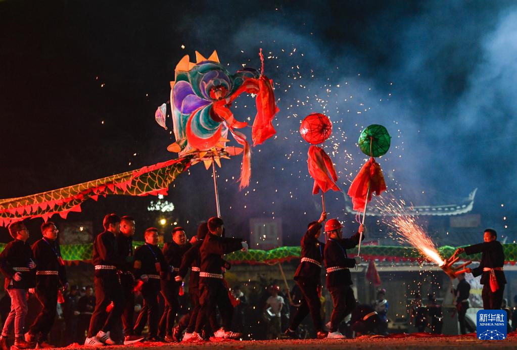 2月4日晚,人们在台江县参加苗族“舞龙嘘花”活动。