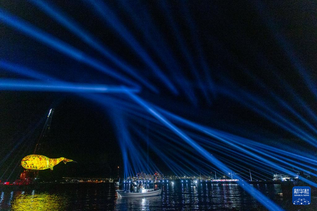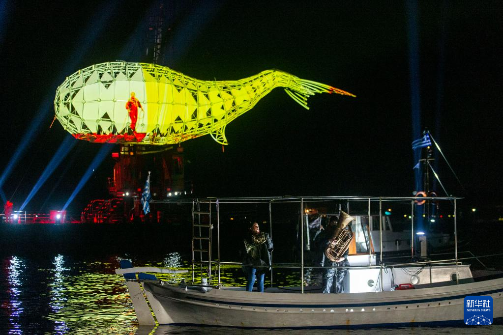 这是2月4日在希腊雅典西部的埃莱夫西斯的庆典现场拍摄的巨型机械鲸鱼。