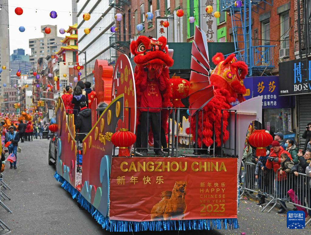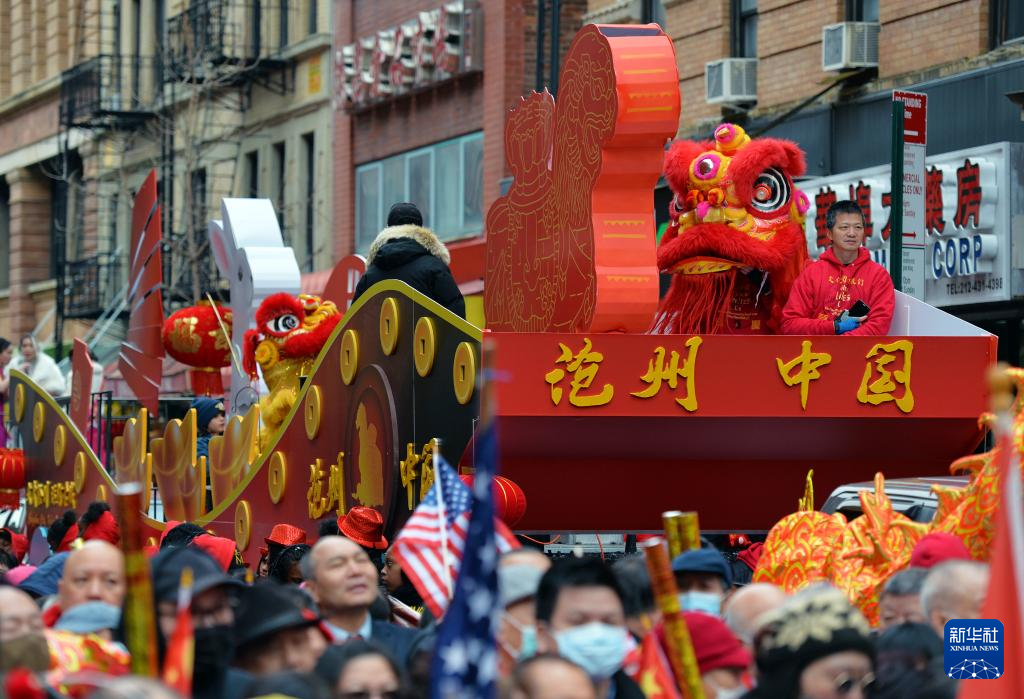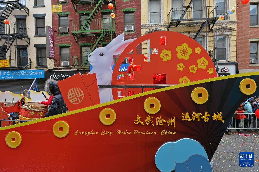 2月12日,在美国纽约,中国河北“文武沧州,运河古城”主题花车参加新春大游行文化节。