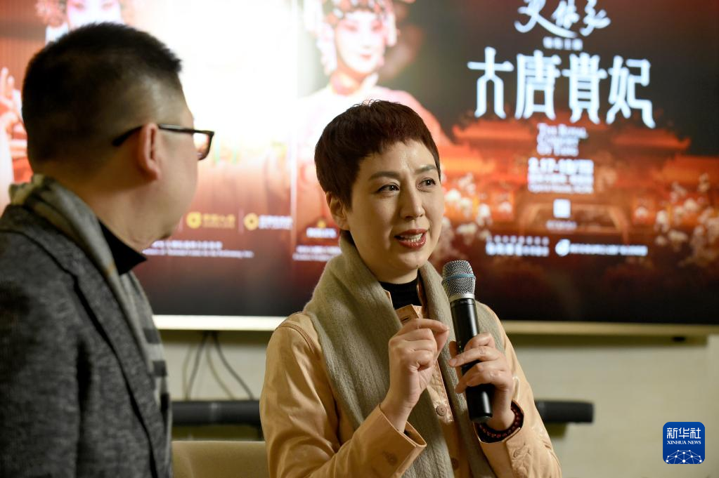 2月14日,京剧演员史依弘(右)在媒体见面会上分享《大唐贵妃》的创排故事。