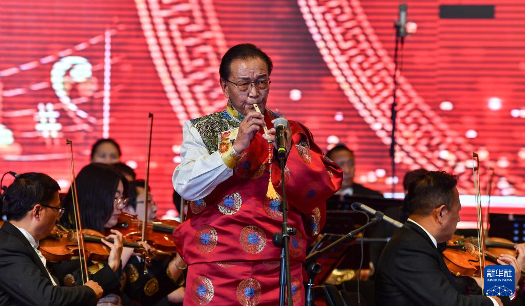 2月18日,演奏家次旦在2023年藏历新年音乐会上表演鹰笛独奏《雪域牧歌》。