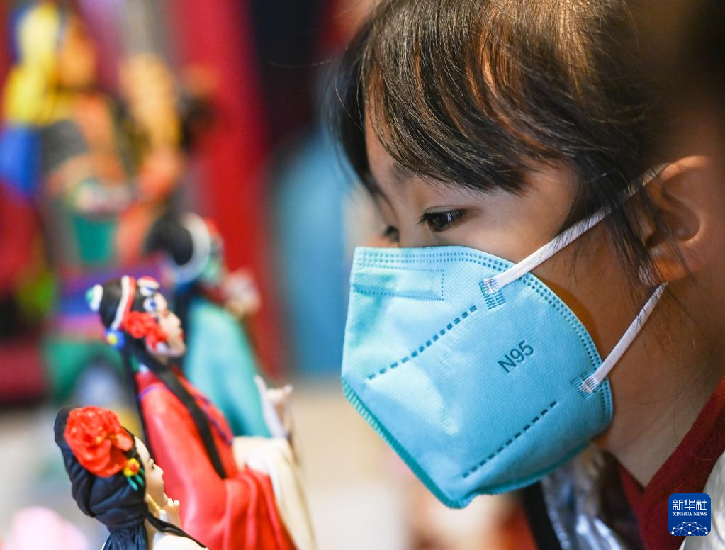 一位小游客在非遗大集上的曹州面人摊位前驻足(2月17日摄)。