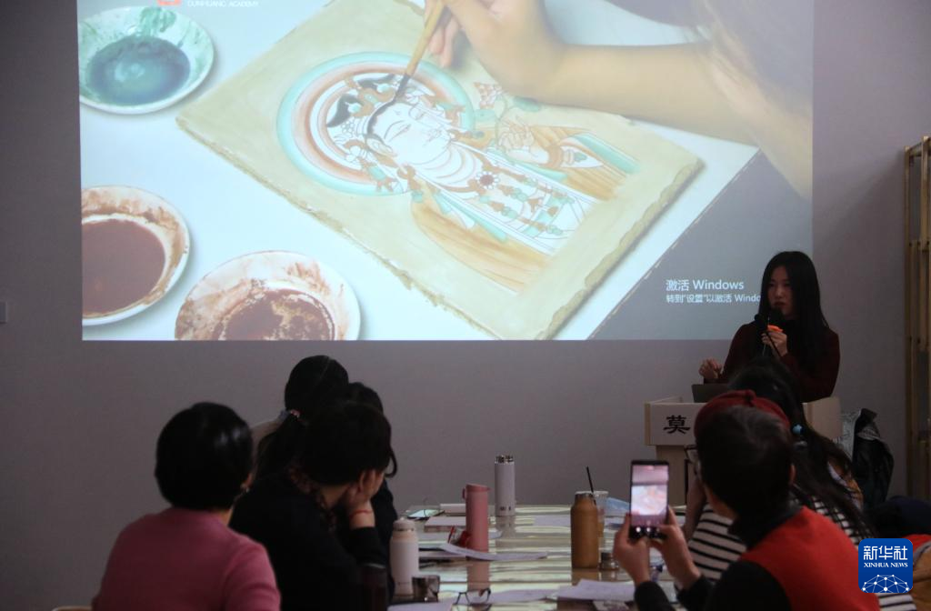 2月23日,在敦煌研究院莫高学堂,研学导师给学员讲授敦煌壁画临摹技法。
