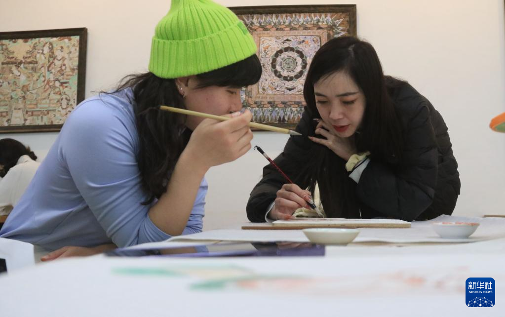 2月23日,在敦煌研究院莫高学堂,研学导师(右)指导学员临摹敦煌壁画。
