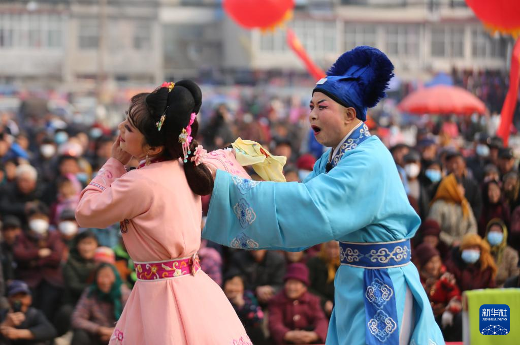 2月24日,戏曲演员在临沂市沂南县依汶镇东依汶村为村民演出吕剧《喝面叶》。