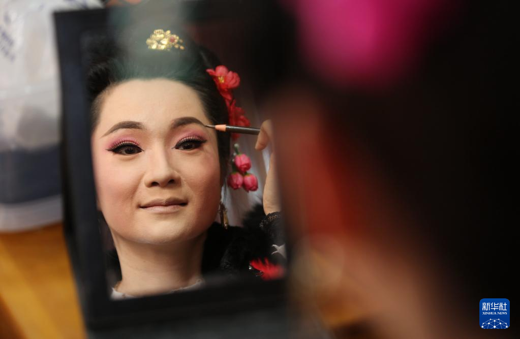 2月24日,在临沂市沂南县依汶镇东依汶村,演员在后台进行演出前的准备。