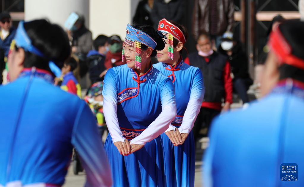 2月27日,在固安县孔雀大湖广场,居民表演舞蹈《草原雪》。
