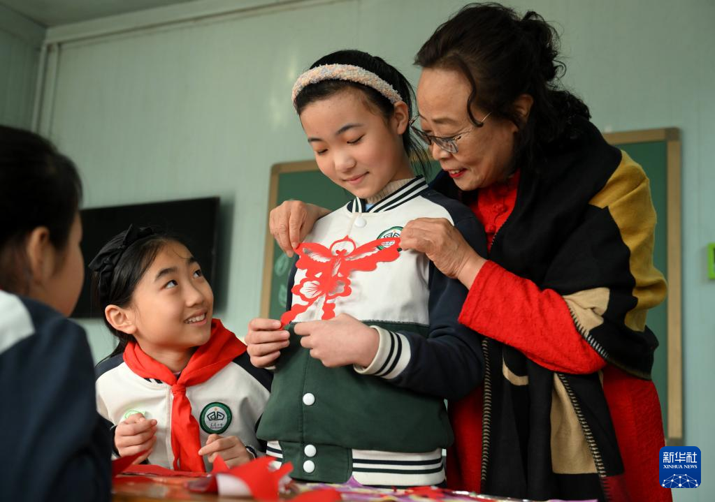 2月28日,国家级非遗蔚县剪纸代表性传承人周淑英(右一)在石家庄市东风小学非遗工坊给学生展示剪纸作品。
