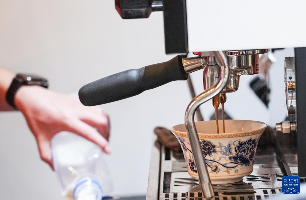 在位于北京大栅栏的内联升“大内·宫保”咖啡厅,工作人员用中式茶杯承装浓缩咖啡(2月18日摄)。