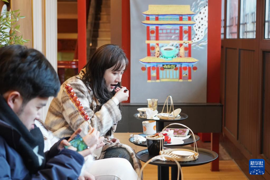 在位于北京大栅栏的内联升“大内·宫保”咖啡厅,顾客在品尝特色茶点(2月18日摄)。
