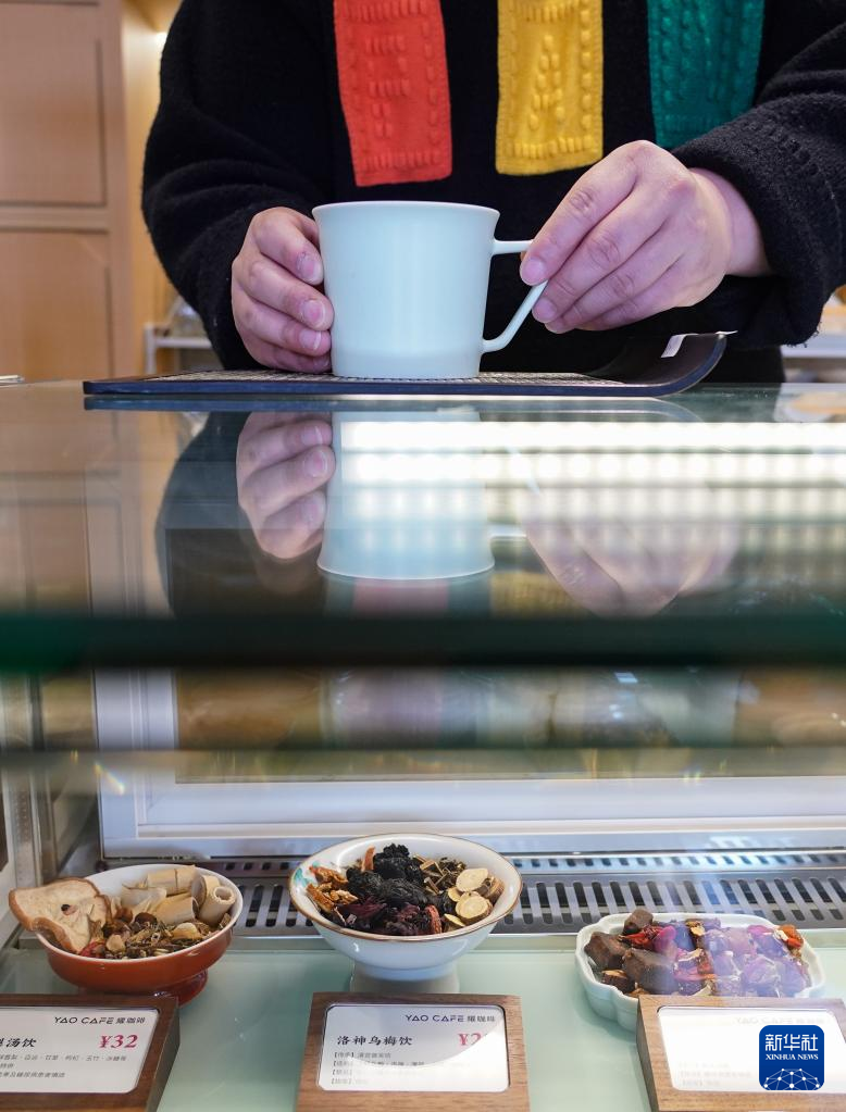 在位于北京西城区的老字号白塔寺药店内的“耀咖啡”,柜台中展示着制作特色饮品的中药材(2月22日摄)。