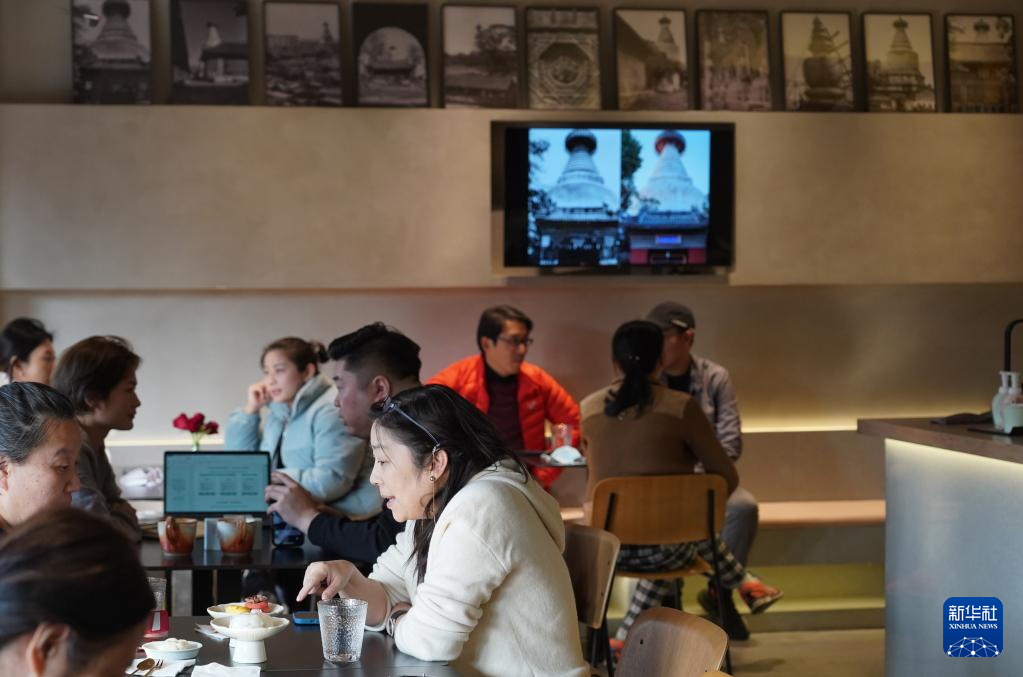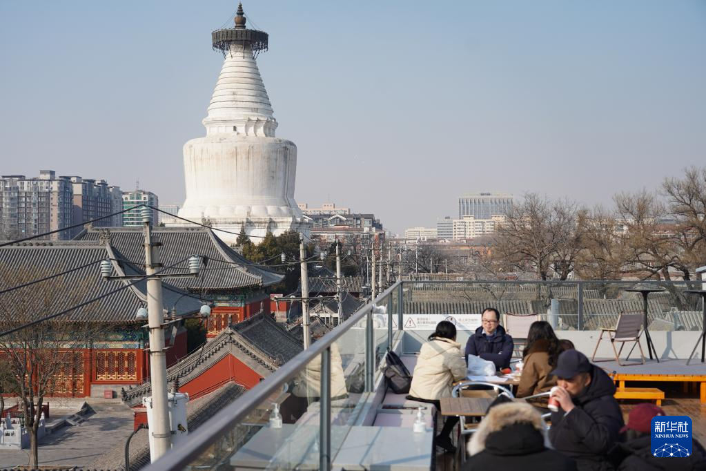 顾客在位于北京西城区的老字号白塔寺药店楼顶品尝饮品(2月22日摄)。