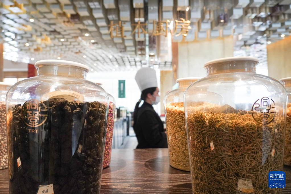 一些草本食材摆放在北京大兴区的同仁堂知嘛健康零号店餐厅内(2月27日摄)。