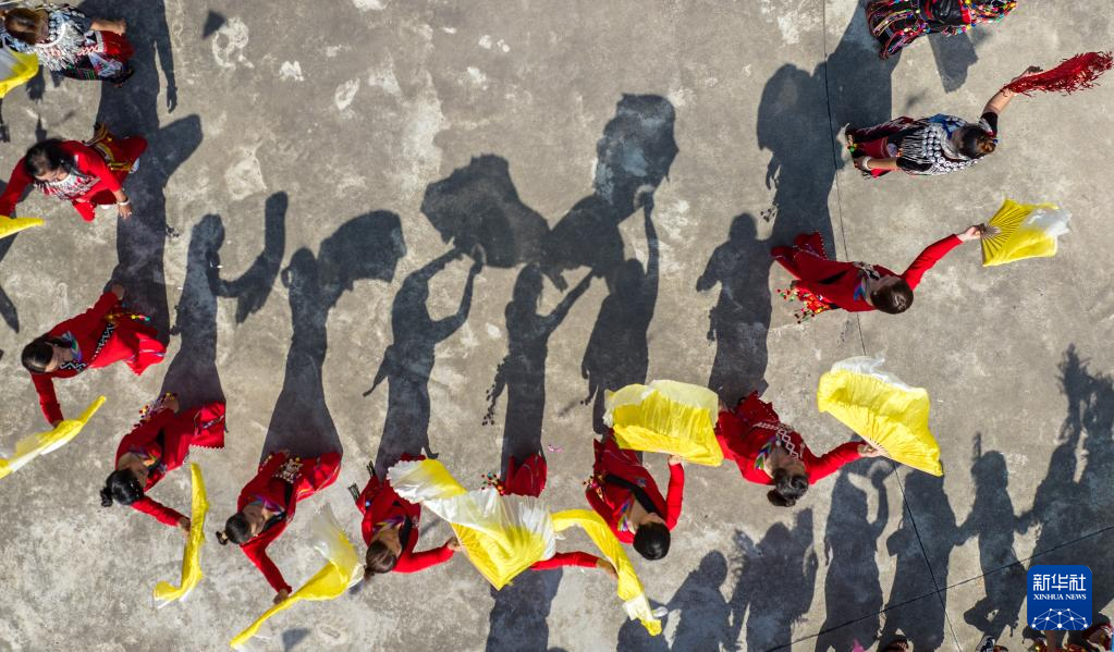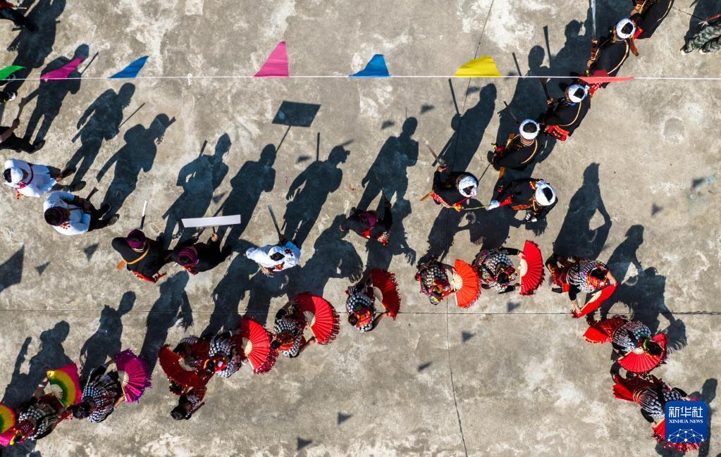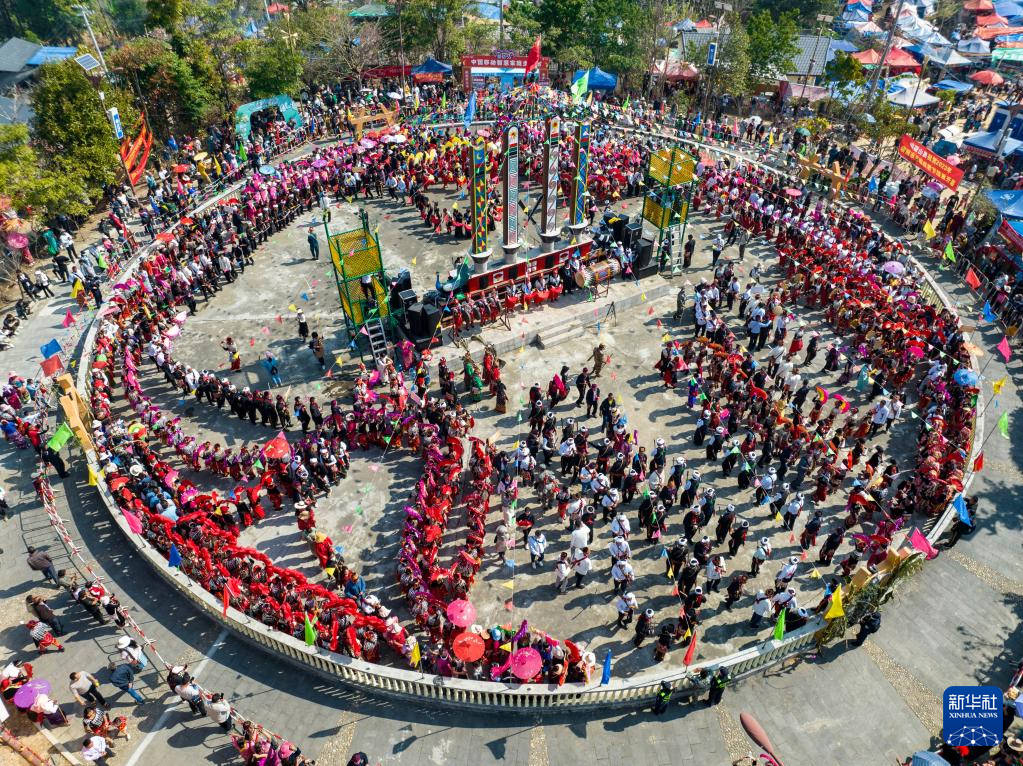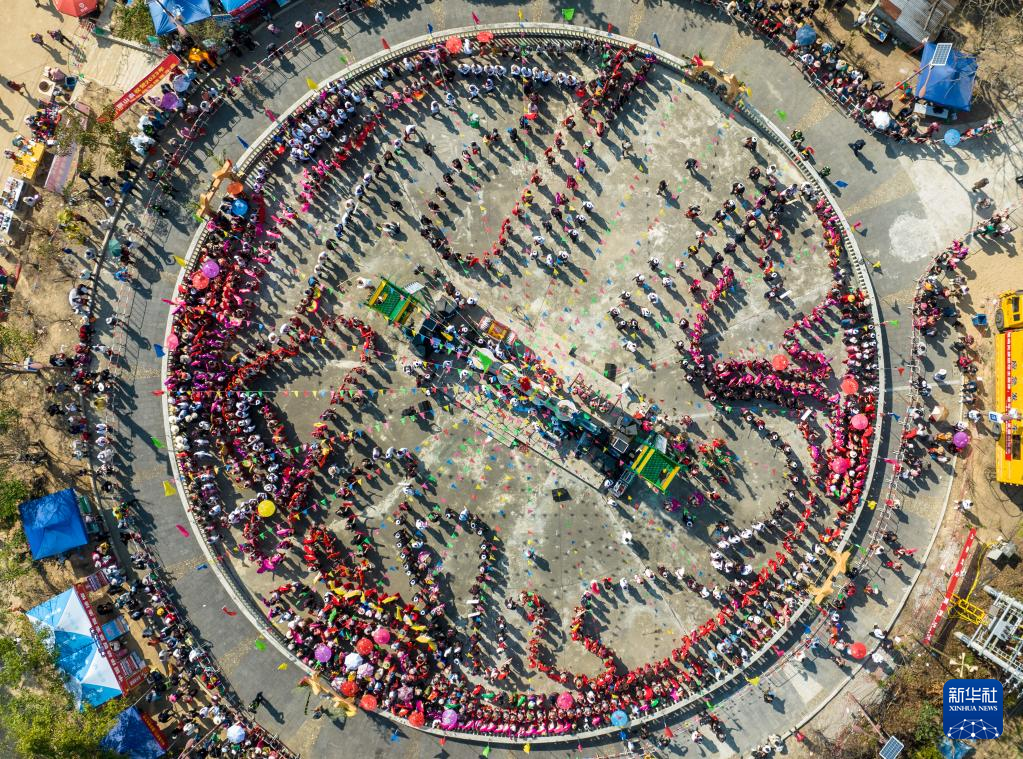 3月2日,当地群众与来自各地的游客踩着相同的鼓点进场舞蹈(无人机照片)。