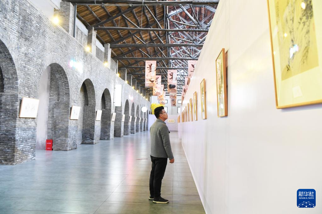 3月21日,参观者在遂平县1955工业文化创意园的老厂房内参观画展。