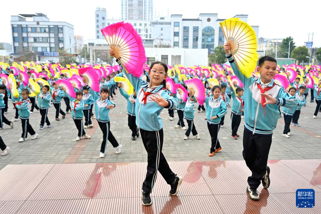 3月22日,在柳城县实验小学总部,学生在课间跳起彩调广播操。
