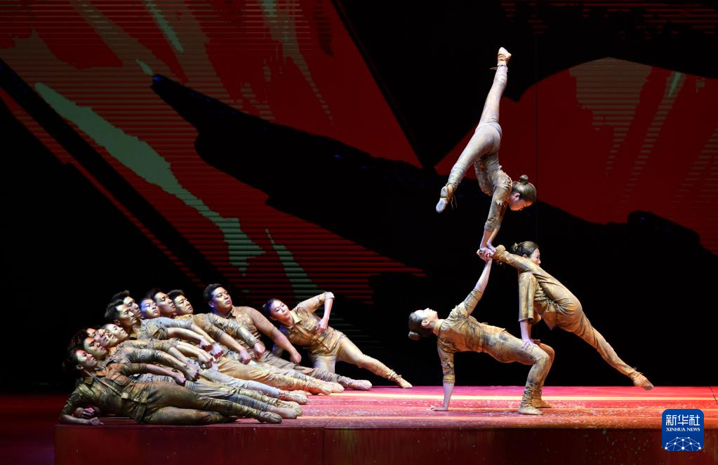 3月28日,在位于山东省济南市的山东省会大剧院,演员表演杂技节目《丰碑》。