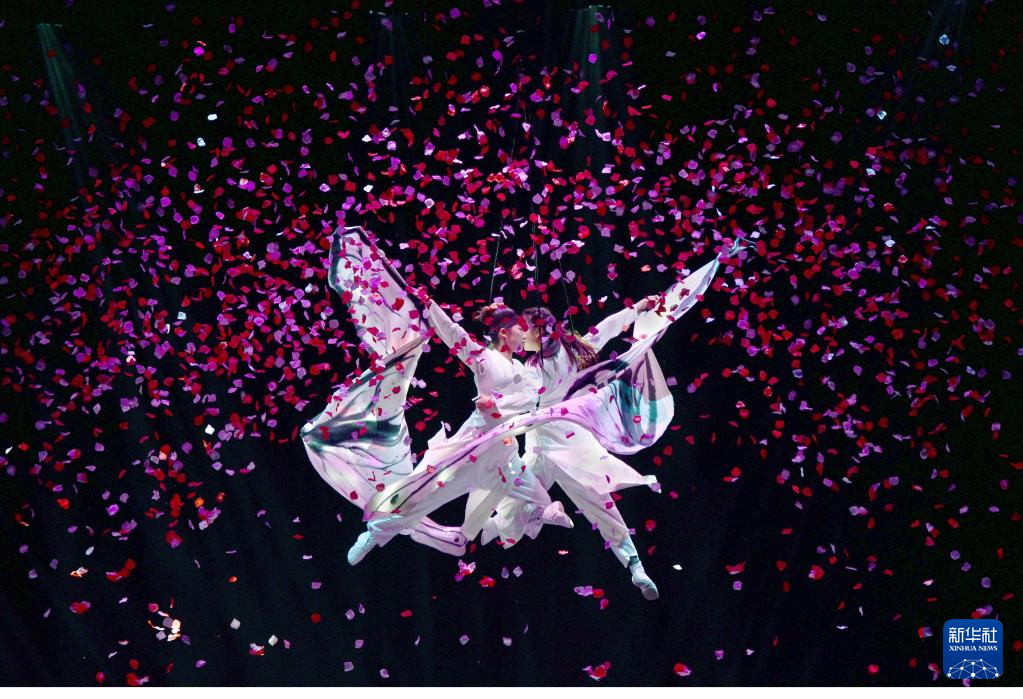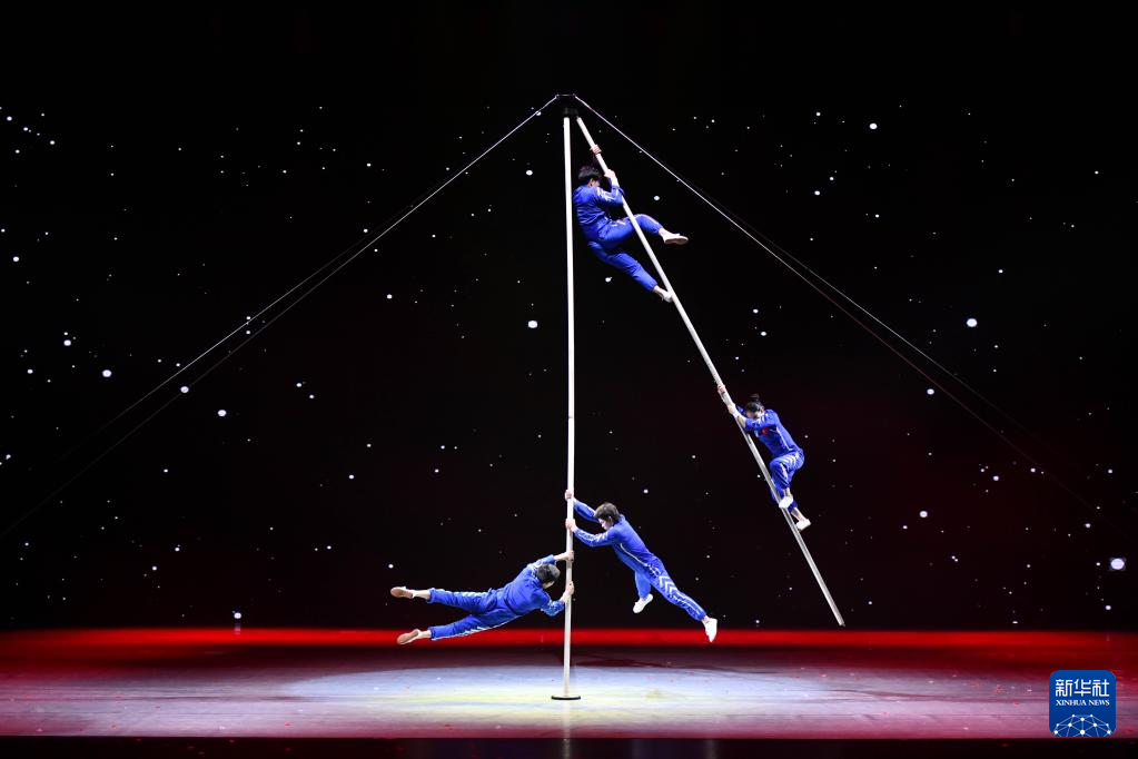 3月28日,在位于山东省济南市的山东省会大剧院,演员表演杂技节目《逐梦空天·男女集体爬杆》。