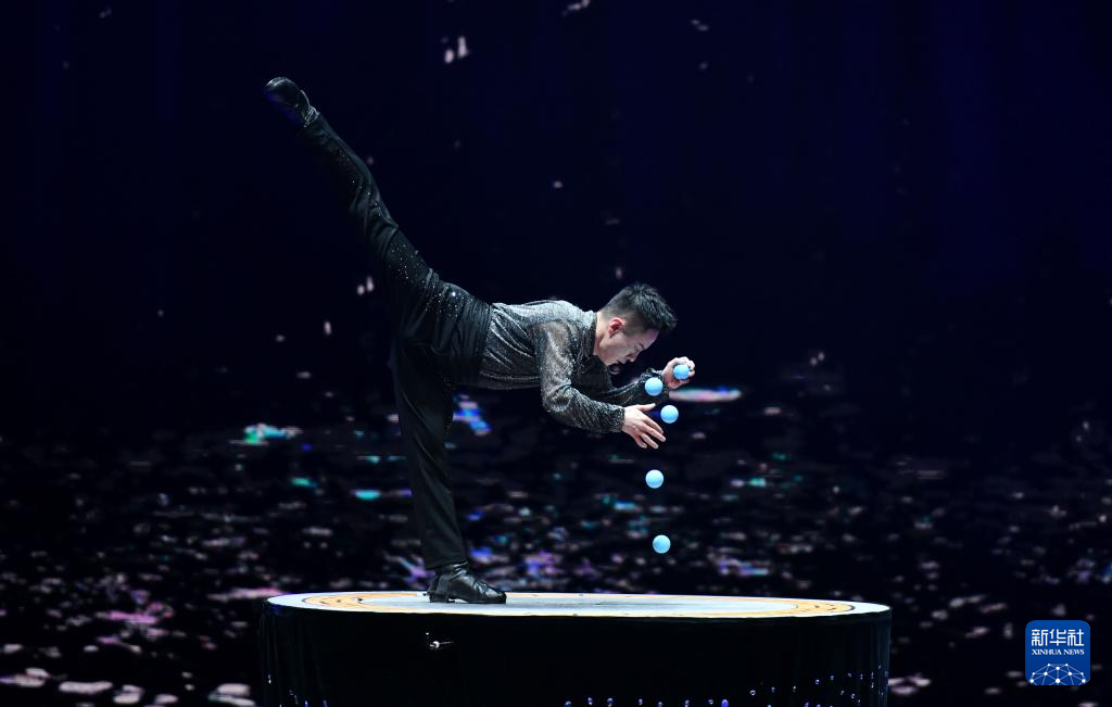 3月28日,在位于山东省济南市的山东省会大剧院,演员表演杂技节目《雨中狂想·球技》。