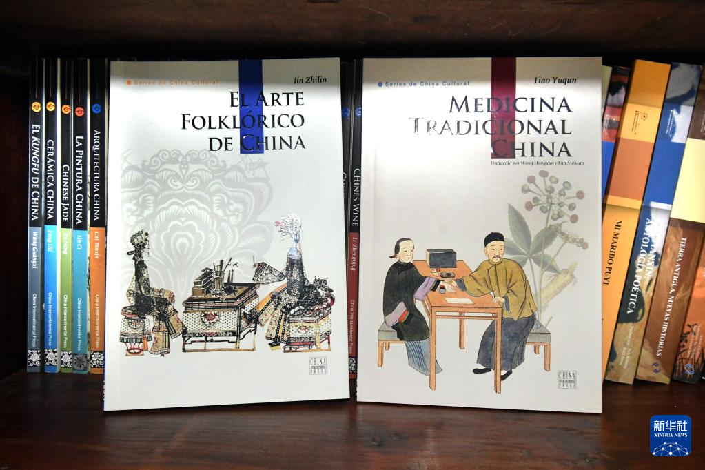 这是4月3日在古巴哈瓦那的中石油长城钻探工程公司古巴项目部拍摄的“中国书架”上的书籍。新华社发(华金·埃尔南德斯 摄)