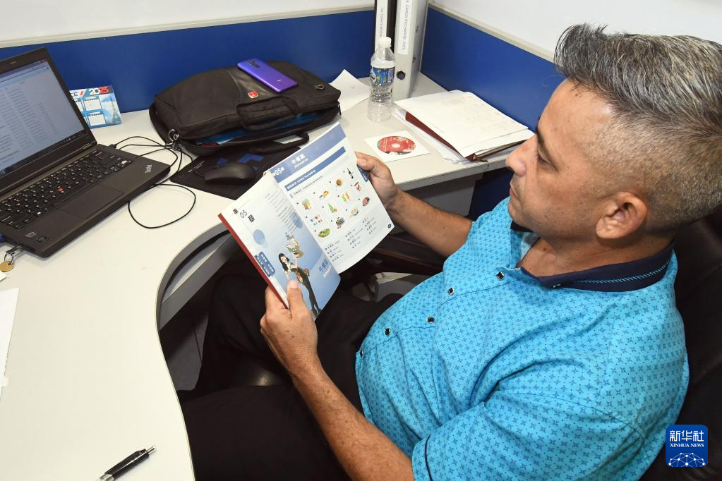 4月3日,在古巴哈瓦那的中石油长城钻探工程公司古巴项目部,一名员工阅读从“中国书架”借来的中文教材。新华社发(华金·埃尔南德斯 摄)