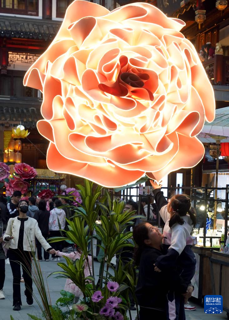 4月7日在豫园商城内拍摄的巨型花朵装置。