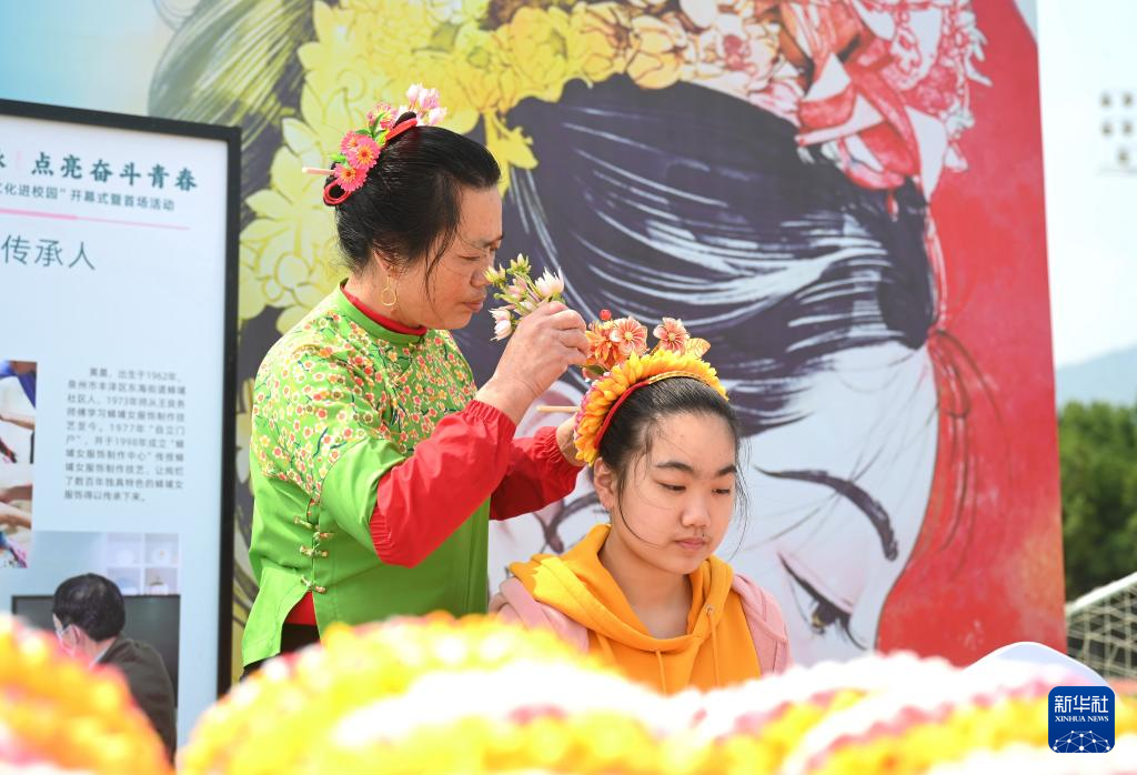 4月8日,泉州蟳埔女在福州大学城“优秀传统文化进校园”开幕式上展示国家级非物质文化遗产蟳埔女习俗头饰簪花围。