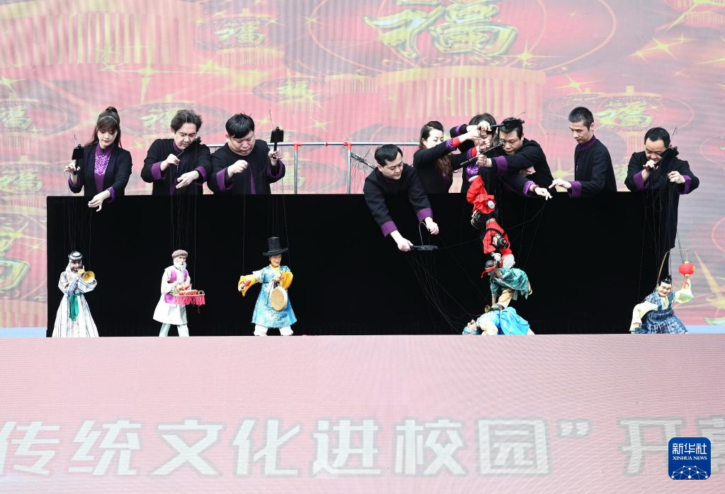 4月8日,泉州市提线木偶戏传承保护中心演员在福州大学城“优秀传统文化进校园”开幕式上表演提线木偶戏《元宵乐》。