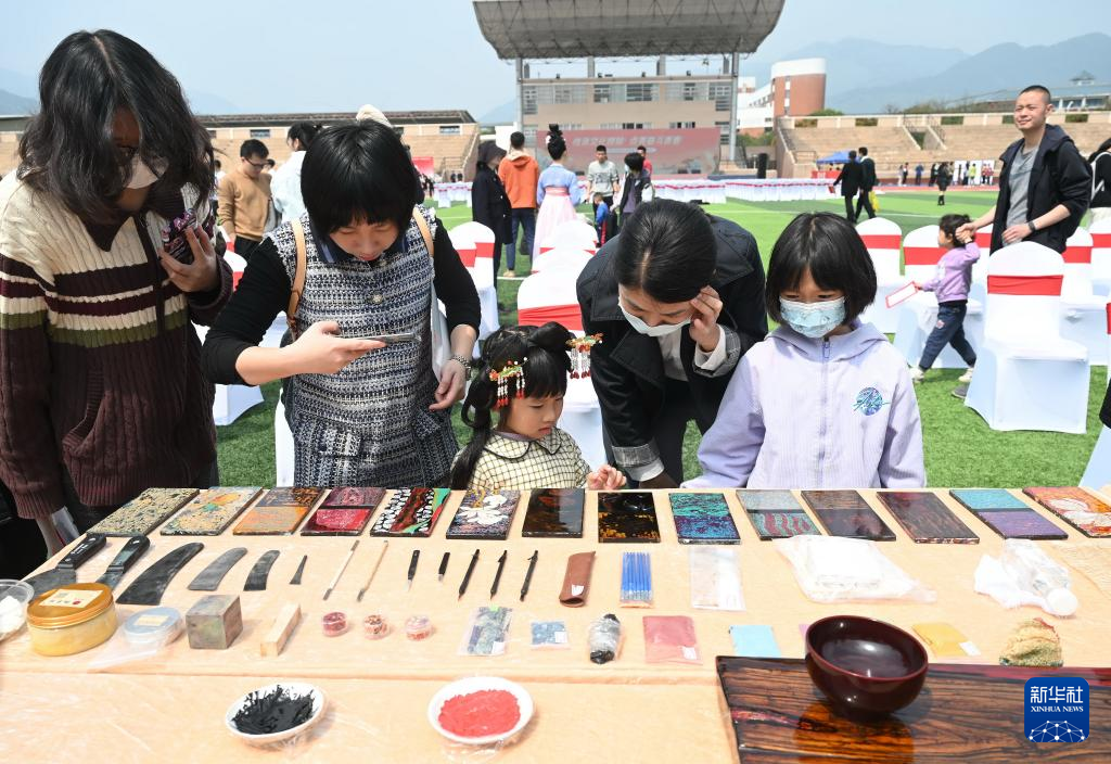 4月8日,参观者在福州大学城“优秀传统文化进校园”开幕式上欣赏福州漆艺制品。