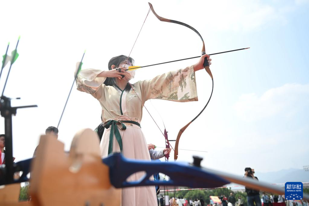 4月8日,学生在福州大学城“优秀传统文化进校园”开幕式上体验射箭。