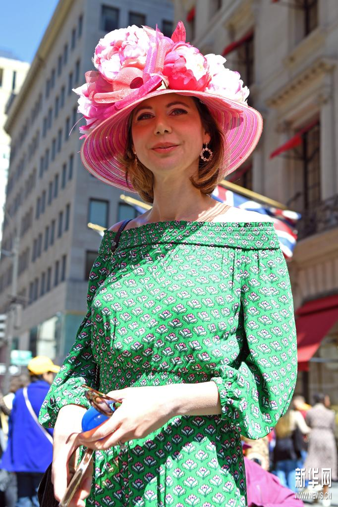 4月9日,在美国纽约,一名女子参加复活节花帽游行。