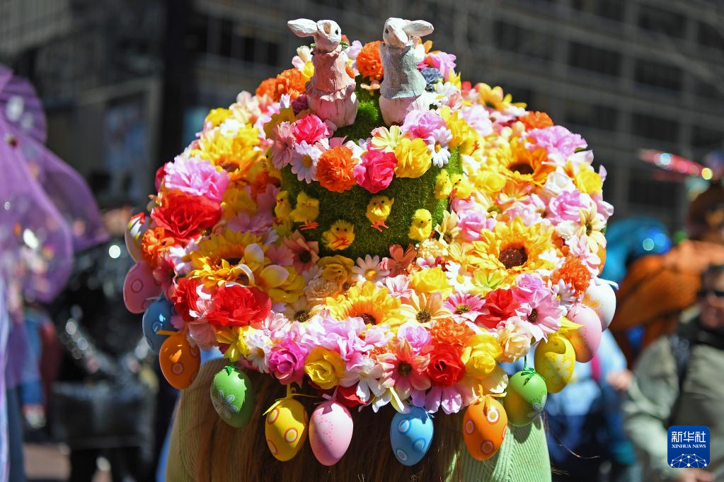 4月9日,在美国纽约,人们参加复活节花帽游行。