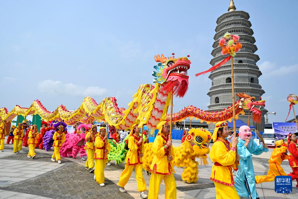 4月20日,在柳城县凤山镇凤鸣广场,孩子们参加舞龙展演活动。