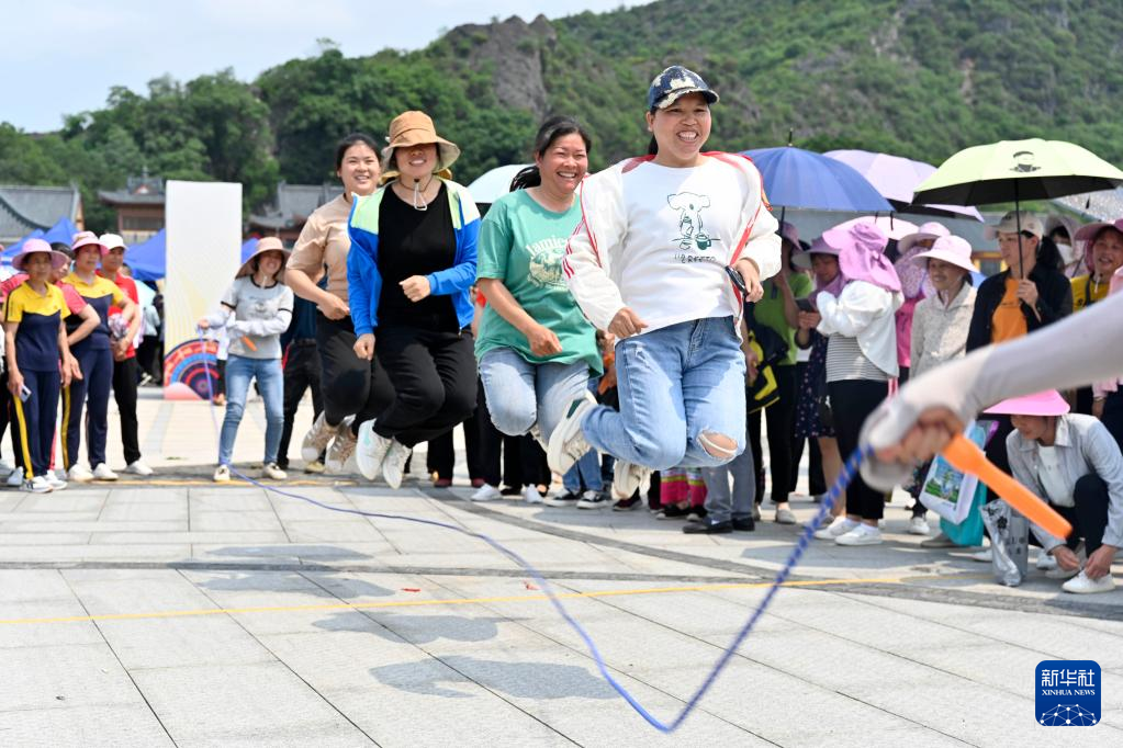 4月20日,在柳城县凤山镇凤鸣广场,村民在跳绳。