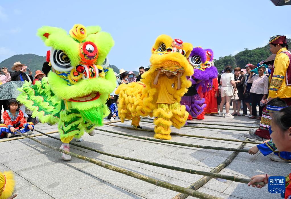 4月20日,在柳城县凤山镇凤鸣广场,舞狮艺人在跳竹竿舞。