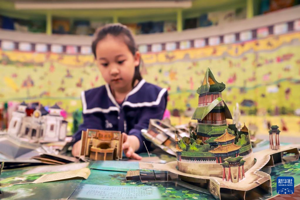 4月22日,一名小朋友在河北省遵化市一家书店翻看立体书。