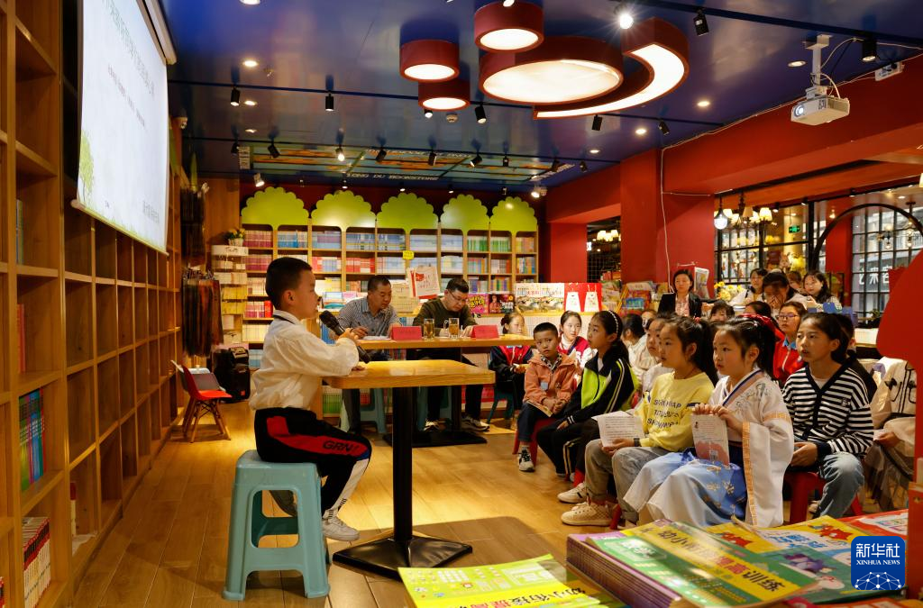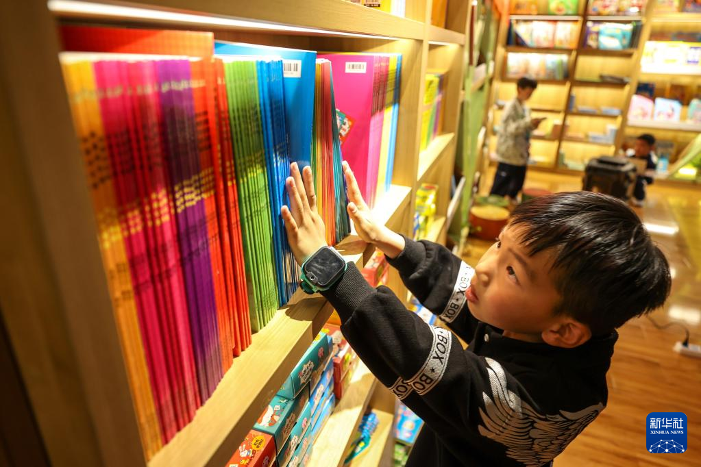 4月22日,小朋友在贵州省毕节市七星关区书香门第书店里挑选书籍。