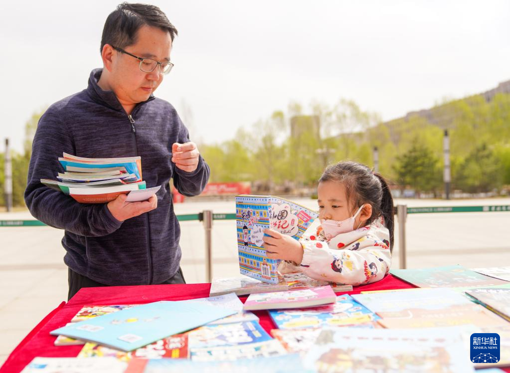 4月22日,市民在吉林省图书馆前的“换书大集”挑选图书。
