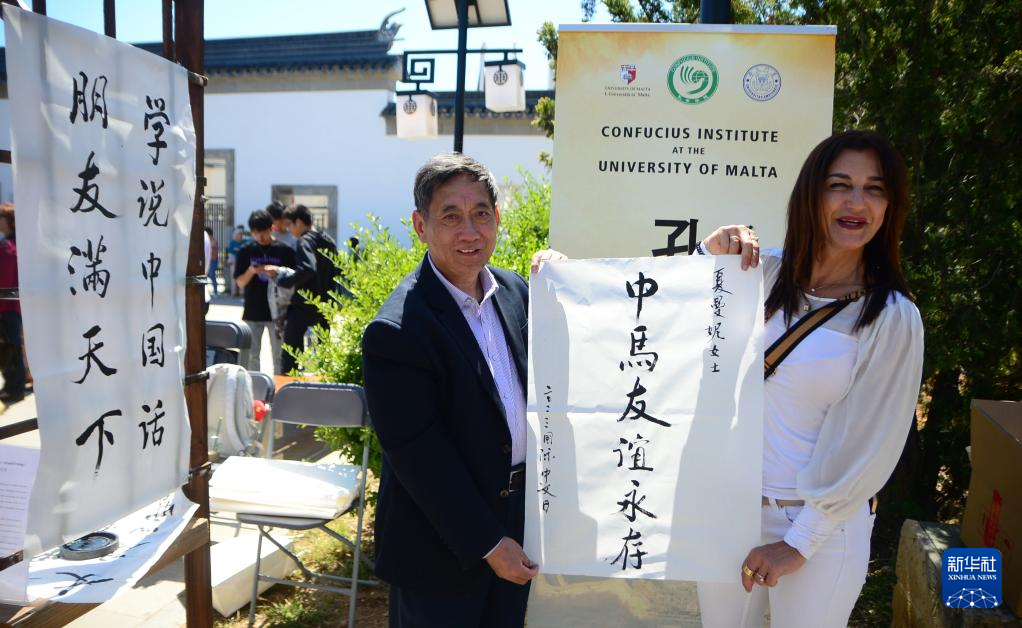 4月23日,在马耳他桑塔露琪亚的中国古典园林“静园”,桑塔露琪亚市市长查梅茵·圣约翰(右)与马耳他大学孔子学院中方院长纪能文展示写有“中马友谊永存”的书法作品。
