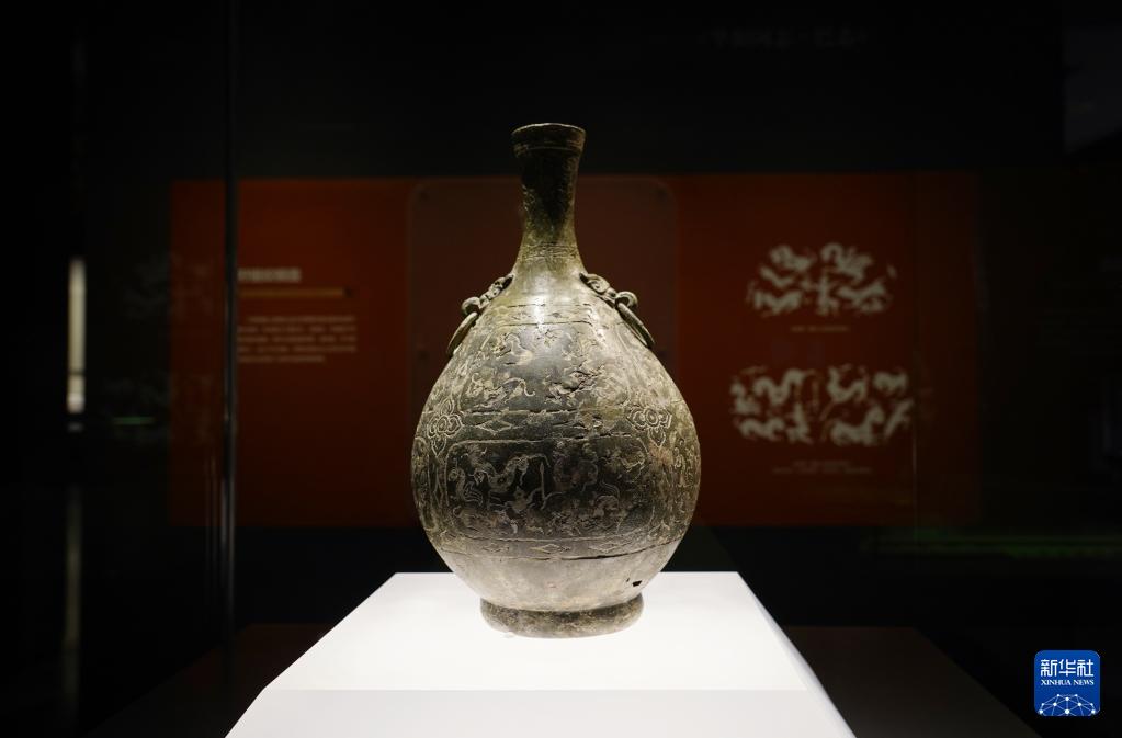 这是4月27日在罗家坝遗址博物馆拍摄的狩猎纹铜壶。