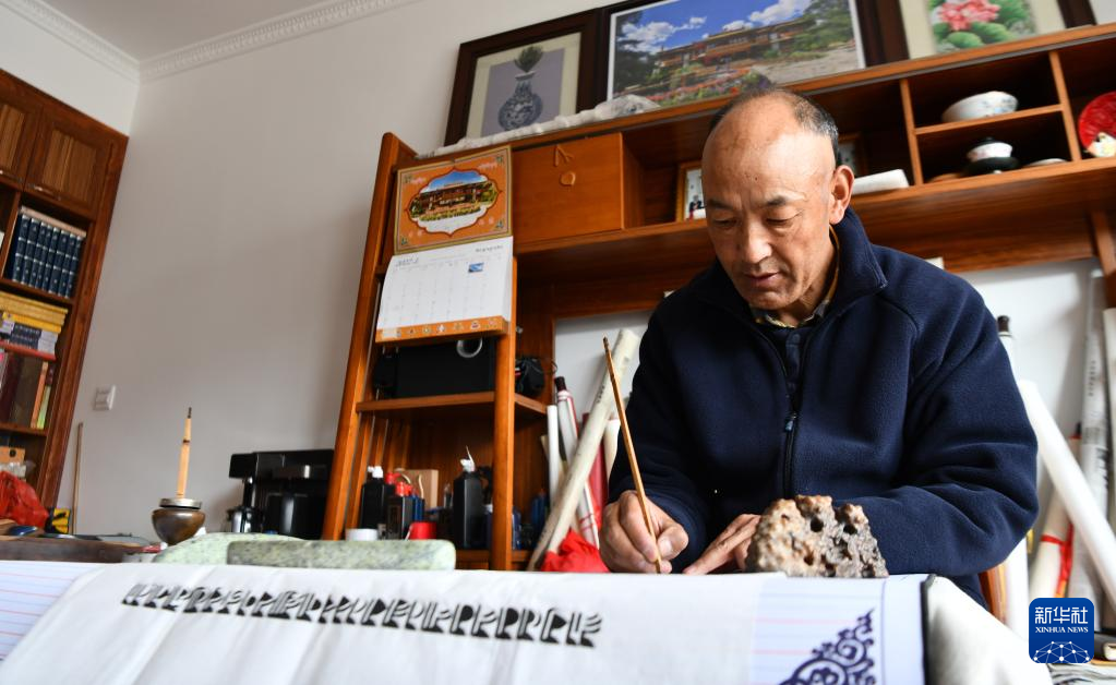久米次成在家中撰写梵文书法(4月19日摄)。