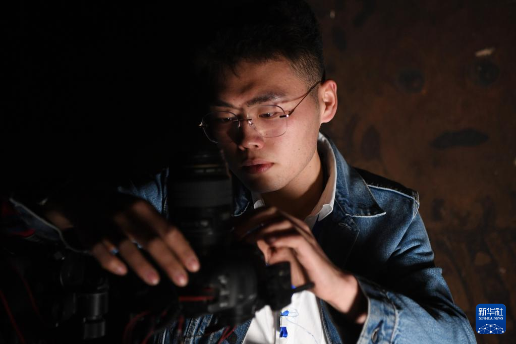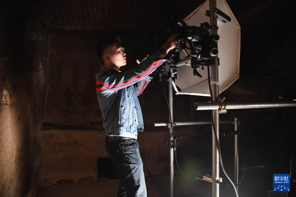 敦煌研究院文物数字化保护团队图像采集人员熊业腾在洞窟内调试设备,准备进行壁画图像采集(4月25日摄)。