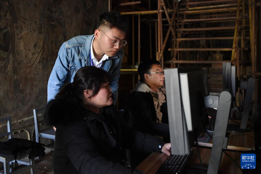 敦煌研究院文物数字化保护团队图像采集人员熊业腾(中)和同事在洞窟内查看刚刚采集到的图片(4月25日摄)。