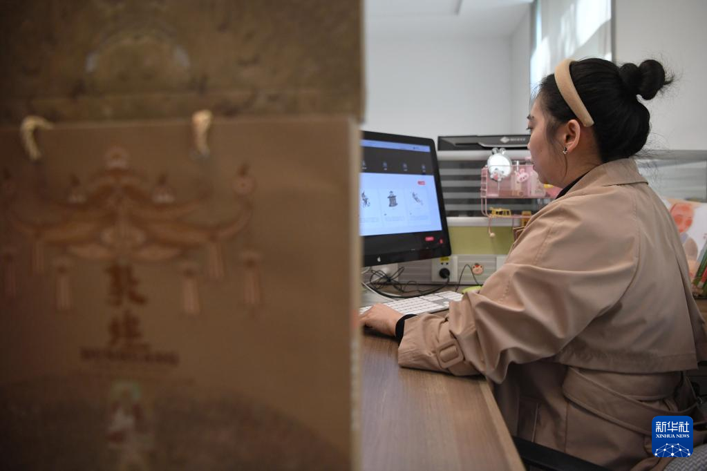敦煌研究院文物数字化保护团队创意营销人员廖雪婷在整理文创产品(4月25日摄)。