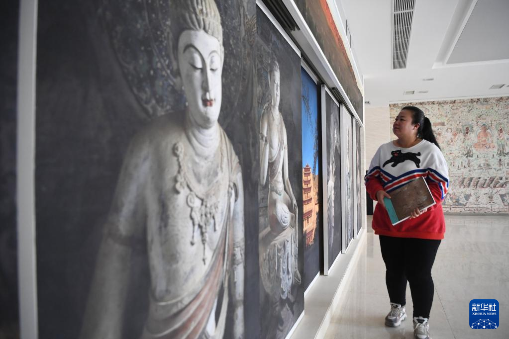 敦煌研究院文物数字化保护团队图像处理人员年海丽从莫高窟照片墙前走过(4月25日摄)。
