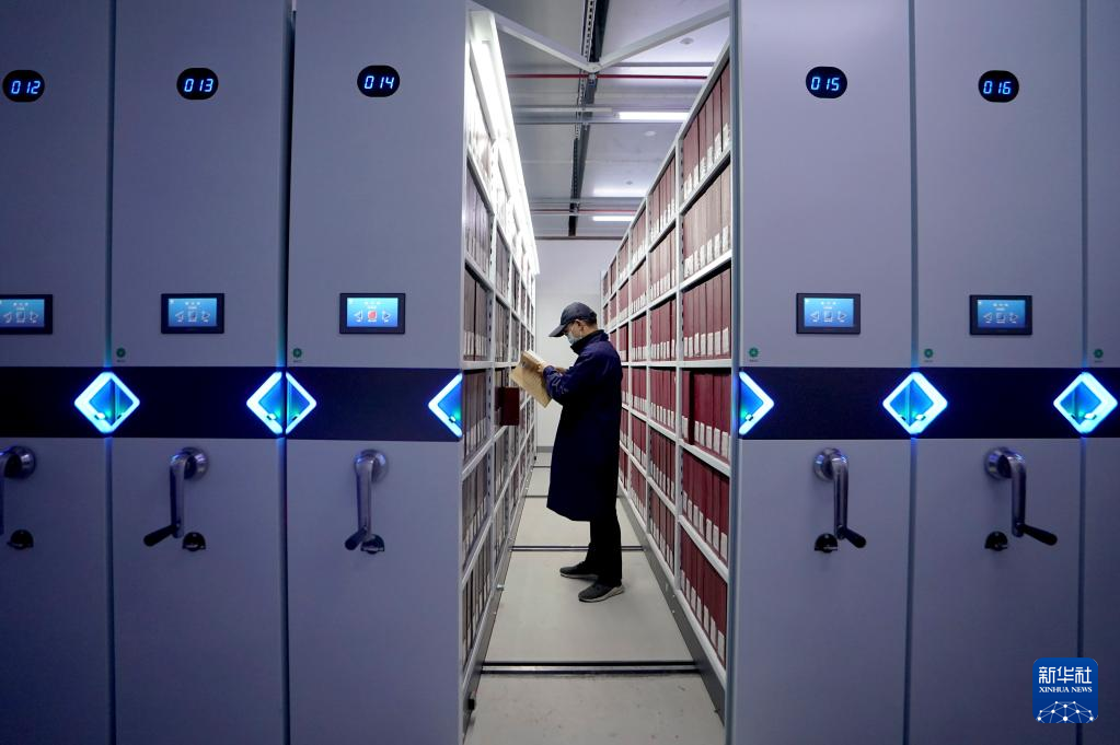 4月28日,在上海市档案馆的库房内,保管部工作人员杜新庆在智能密集架间提取档案。