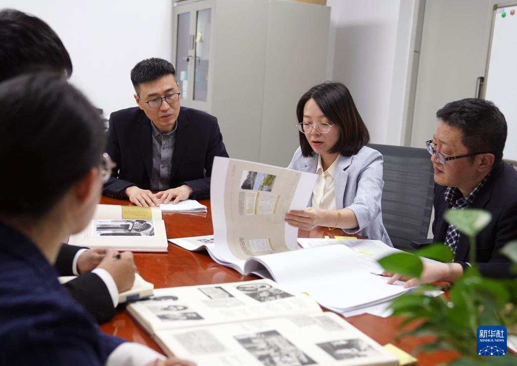 4月28日,在上海市档案馆的办公室内,利用部工作人员方华(右二)和同事们讨论策展工作的细节。