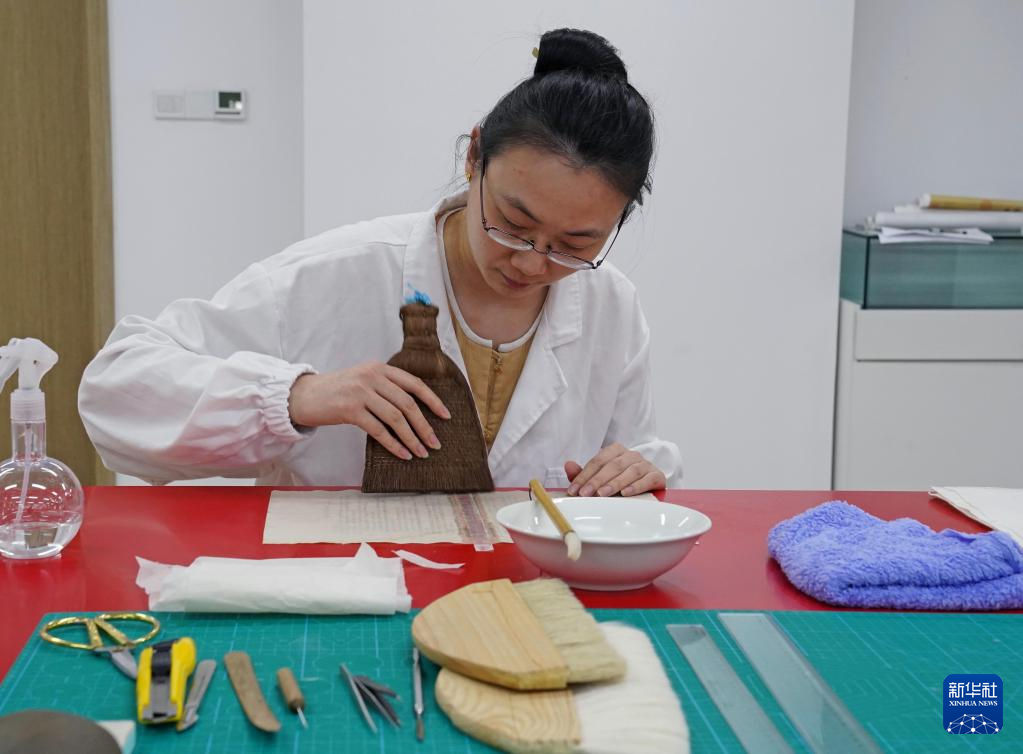 4月28日,在上海市档案馆的保护技术部,档案修复师任翘楚利用专业设备对档案进行展平处理。