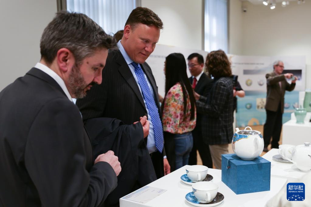 5月4日,一名参观者(左)在比利时布鲁塞尔的中国文化中心品茗。